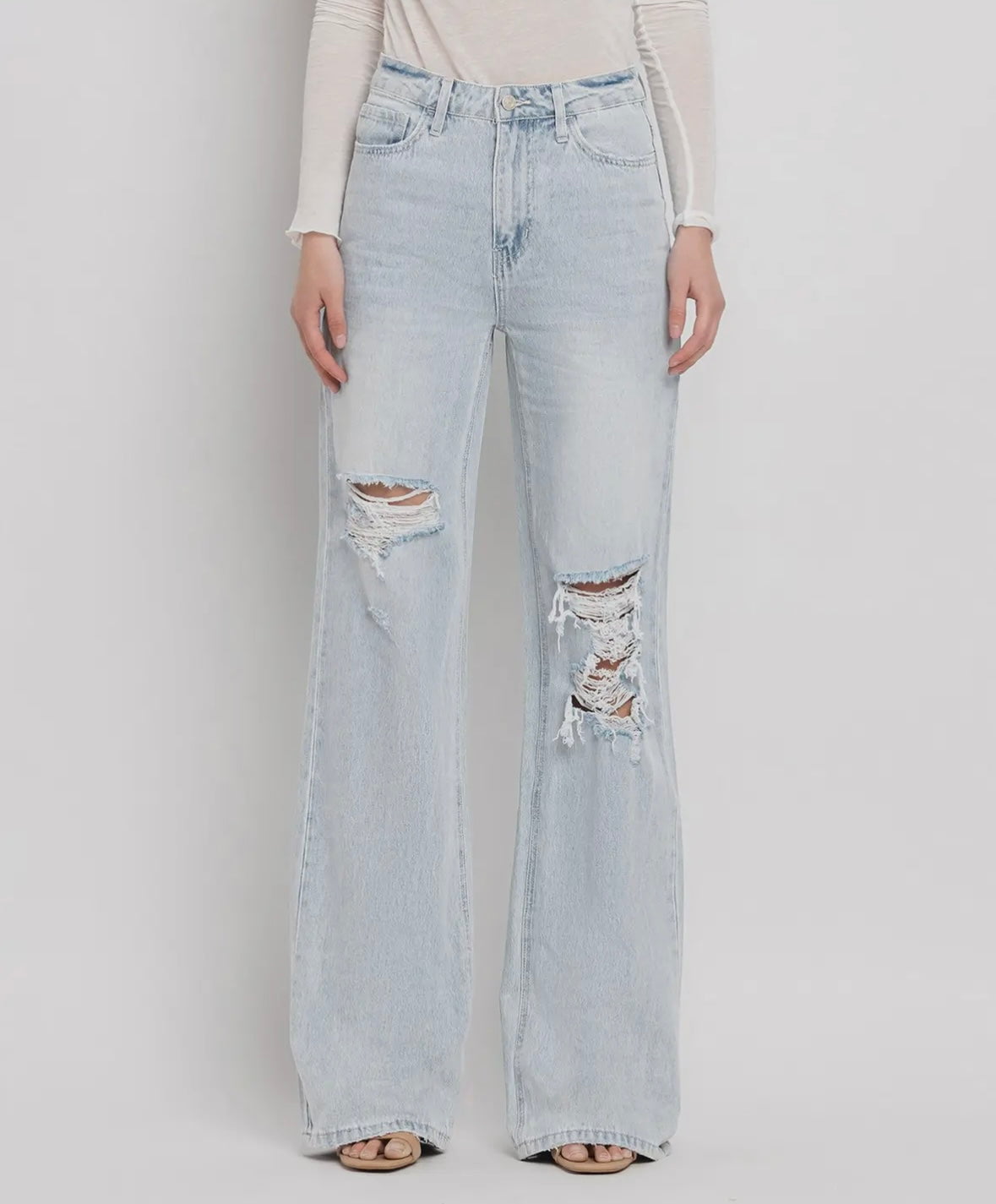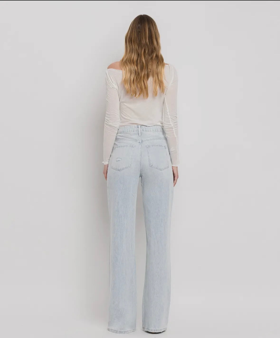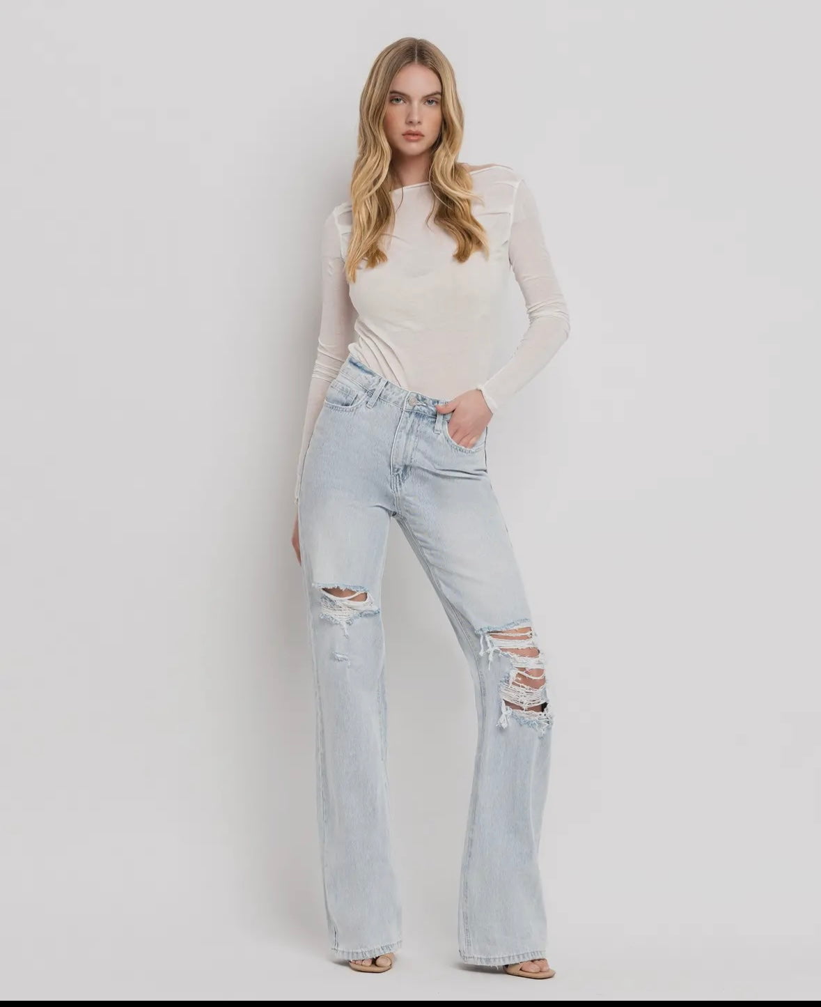 Comfort stretch denim, super high rise waist, lightly distressed detail, finished hem, full length,