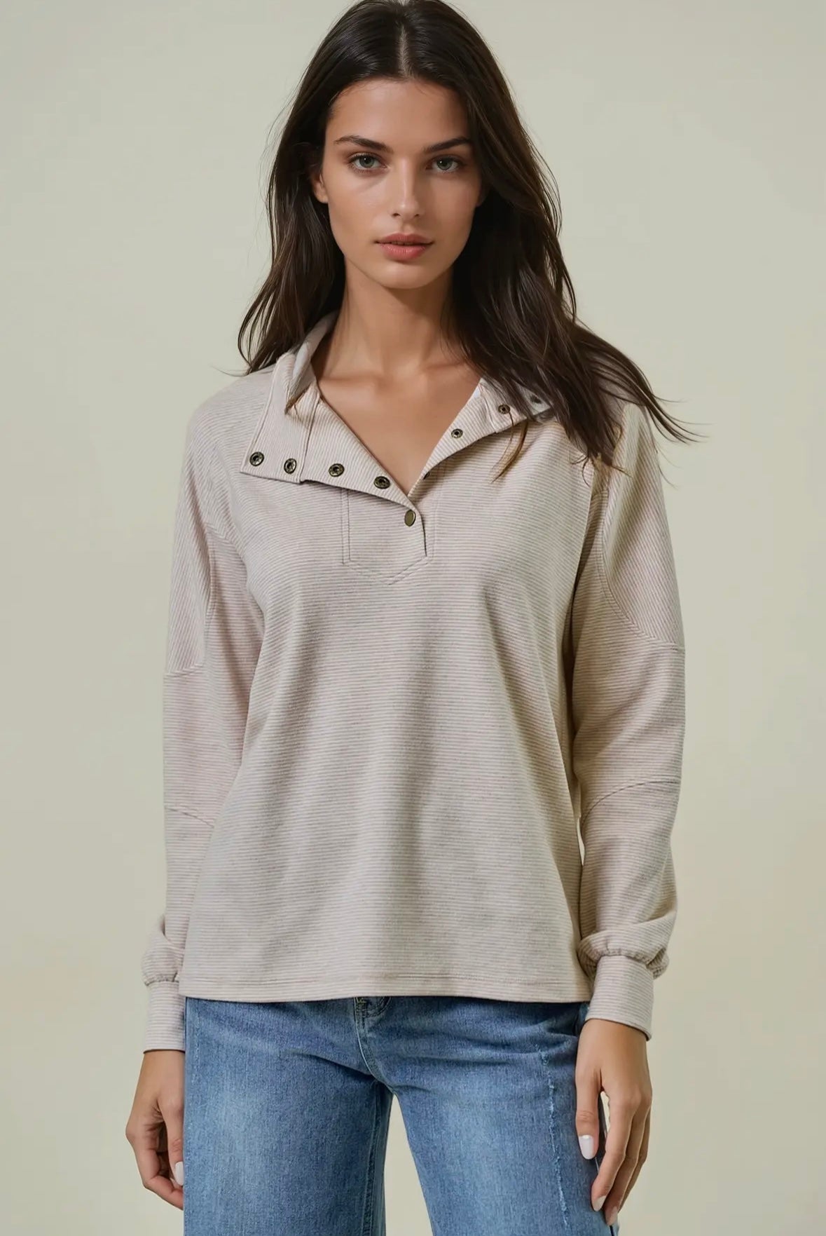 Introducing our elegant cream button quarter sweater, a perfect blend of style and comfort. Crafted from a soft, lightweight fabric, this sweater features a chic quarter-button neckline, allowing for versatile styling options. The creamy hue adds a touch of warmth, making it an ideal layering piece for any season. Its relaxed fit drapes beautifully, while the subtle details, like ribbed cuffs and hem, provide an elevated touch. Pair it with jeans for a casual day out or dress it up with tailored trousers for a polished look. Embrace effortless sophistication with this wardrobe essential.