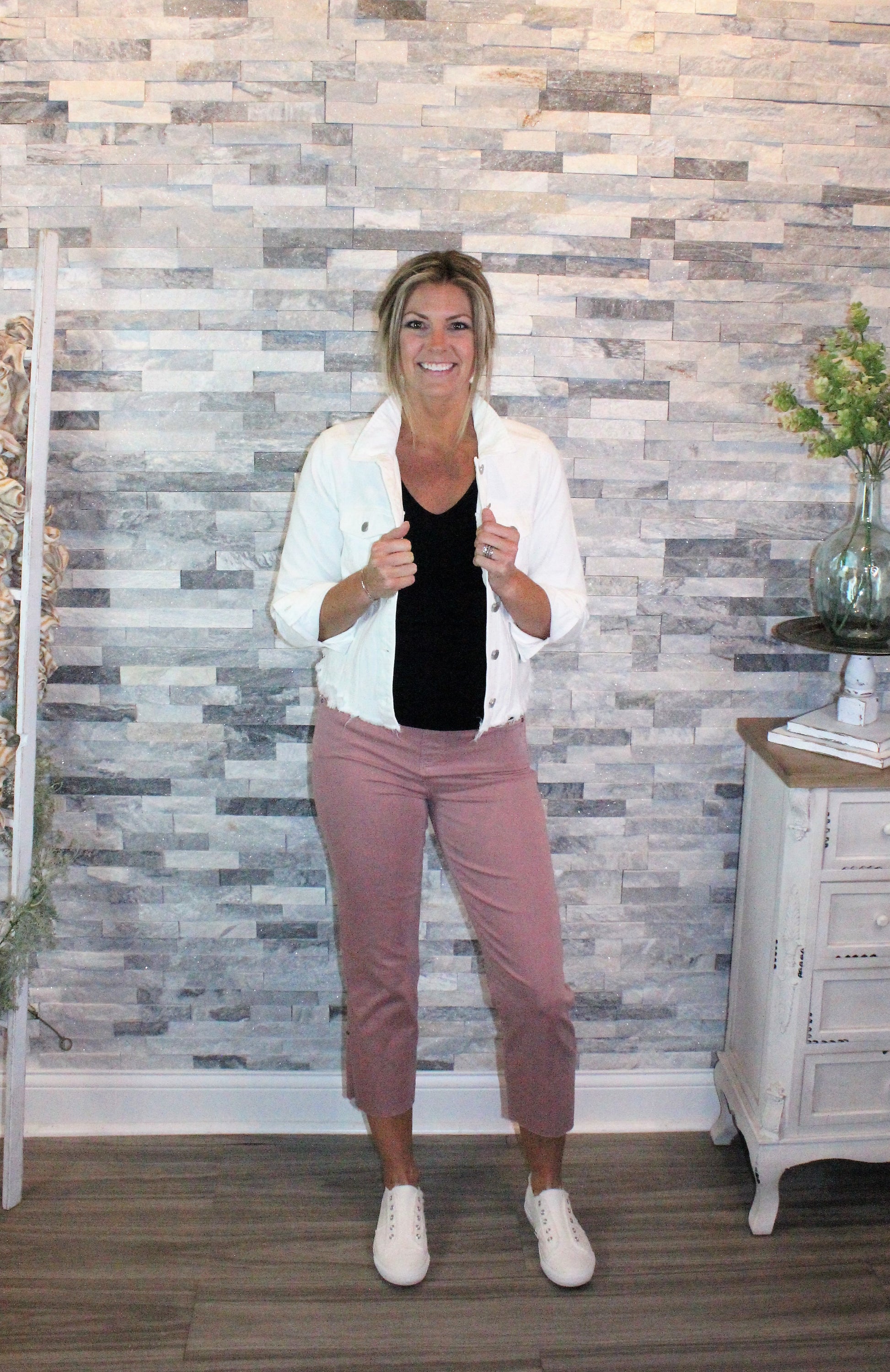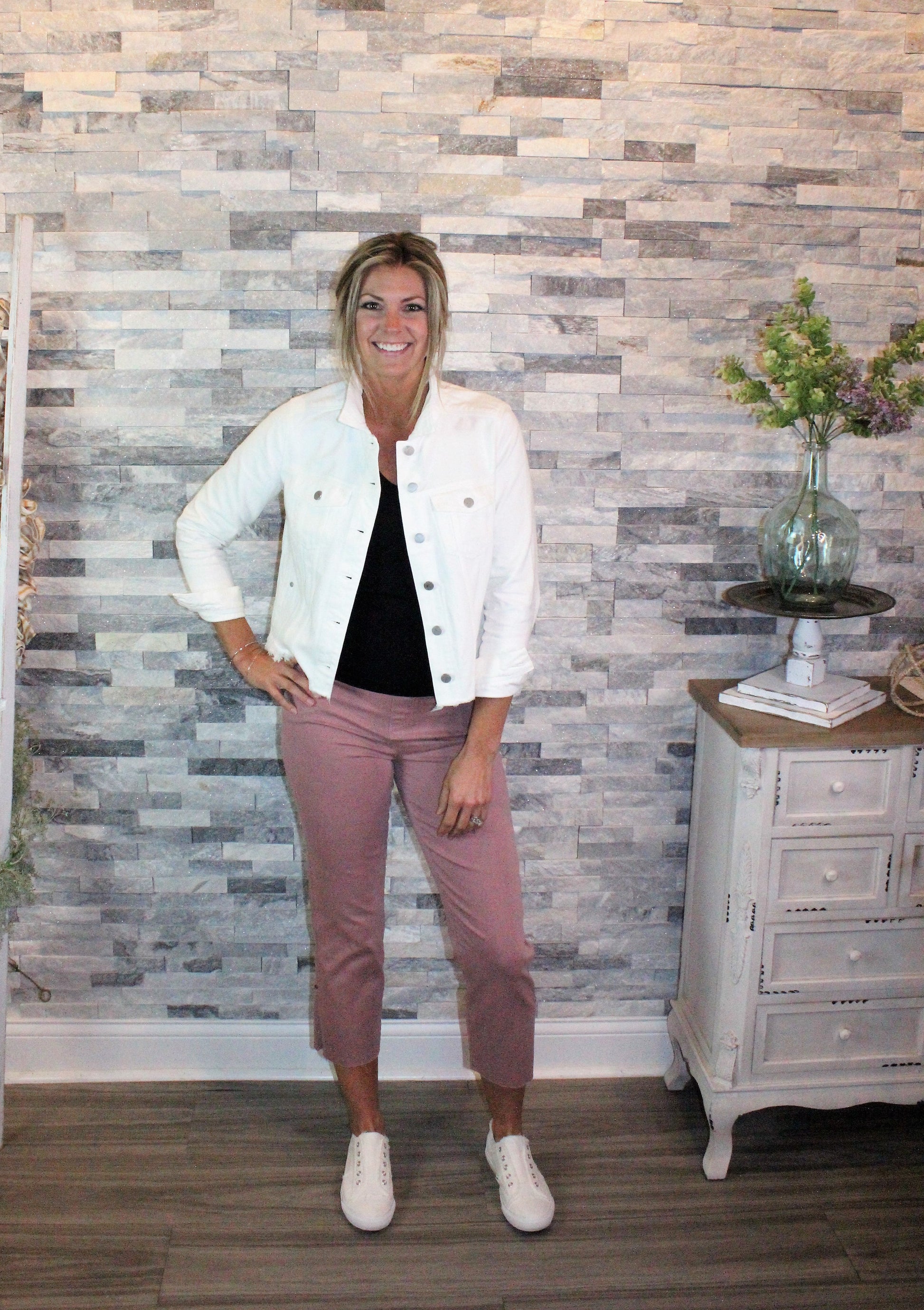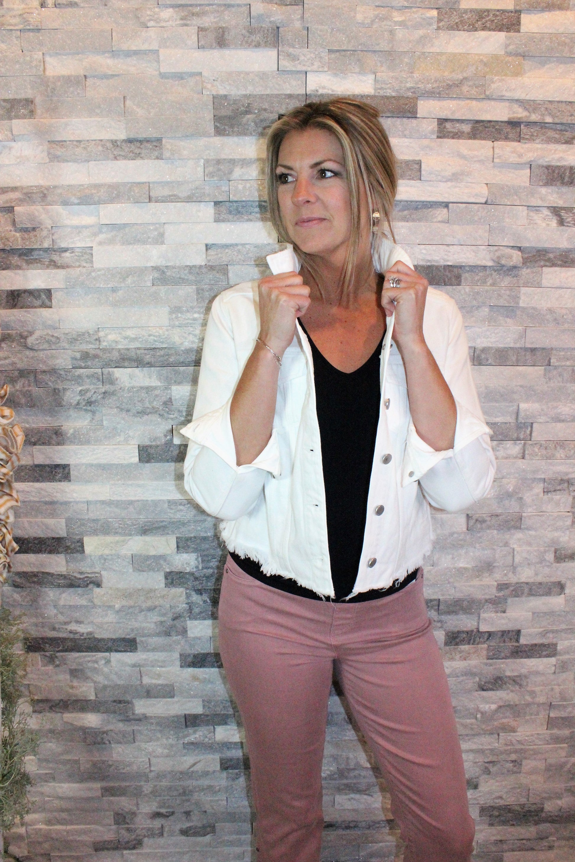 This denim layering piece adds character to your look. Cropped at the perfect length for versatility. The shredded hem detail and white wash makes this unique style a fantastic choice for any outfit.