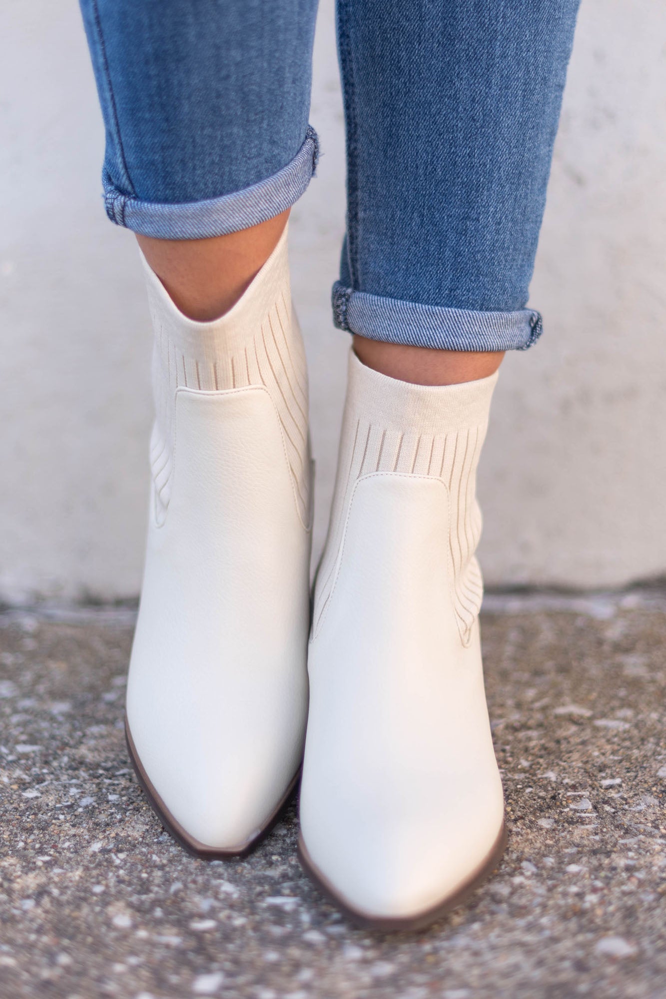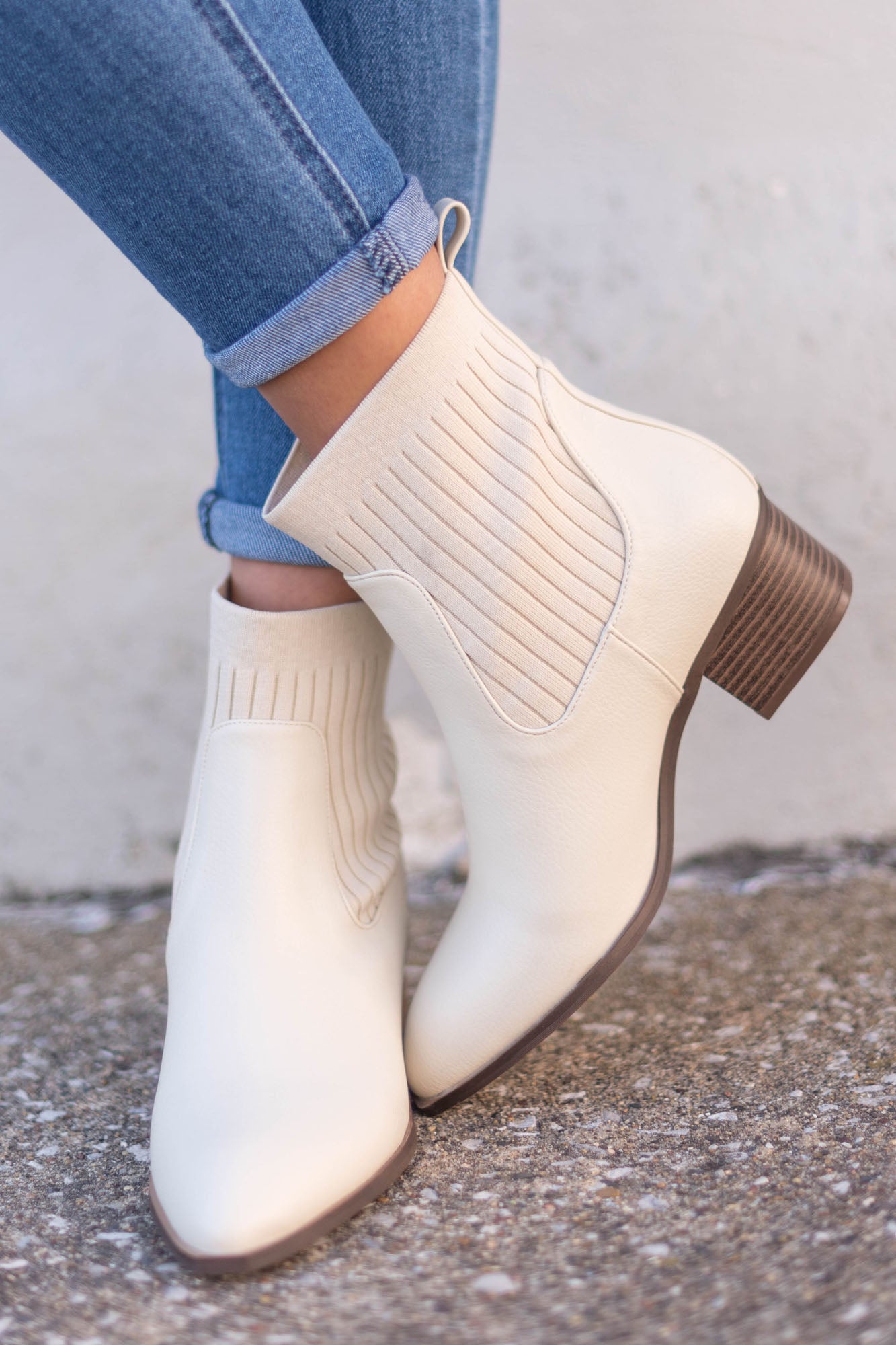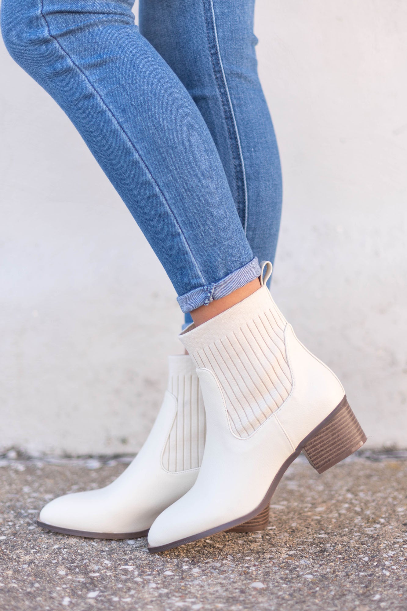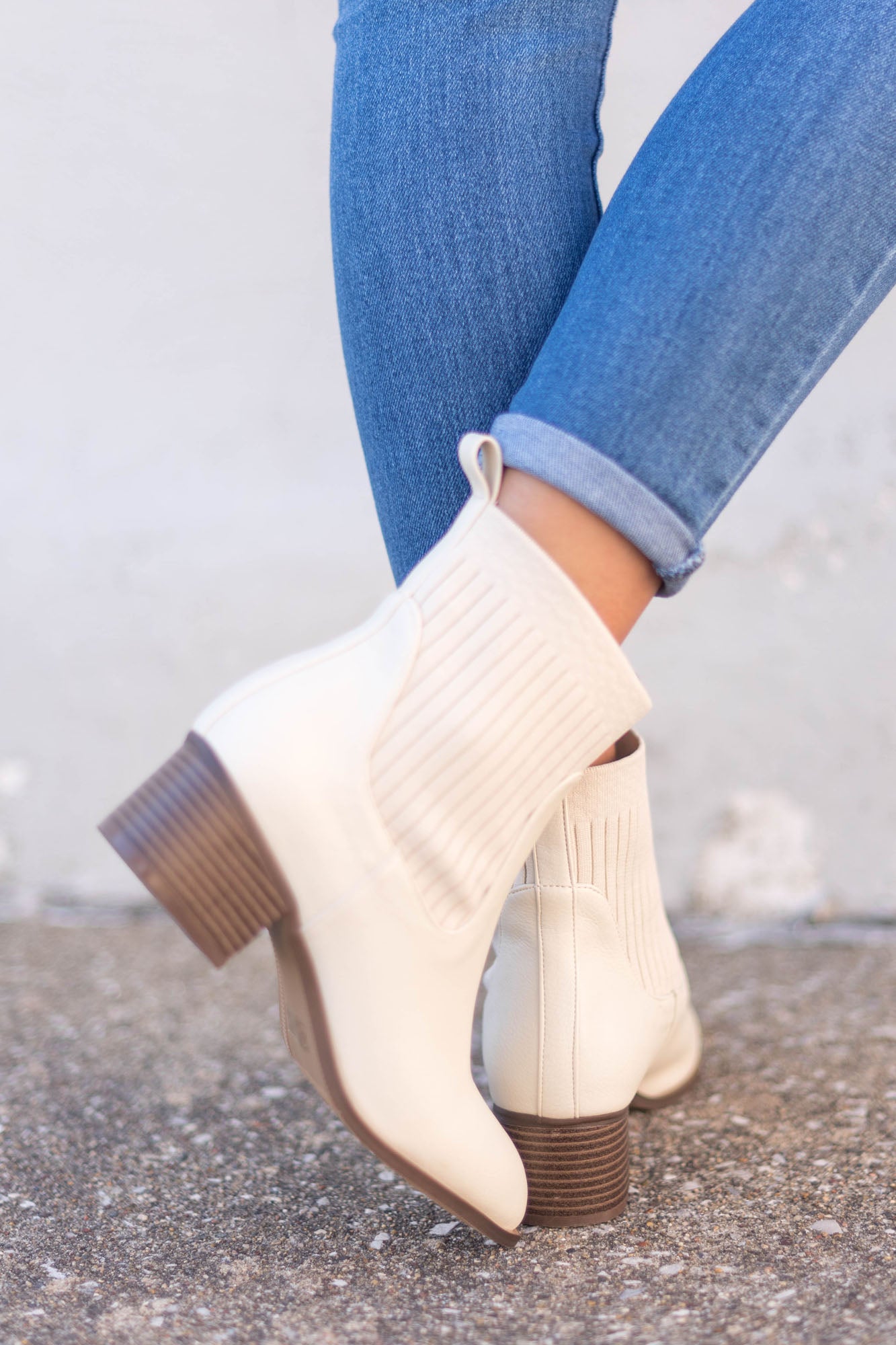 The everyday bootie is here!! We love the fun knit sock design of these boots! Featuring a partial squared off pointed toe, small heel and faux leather.
