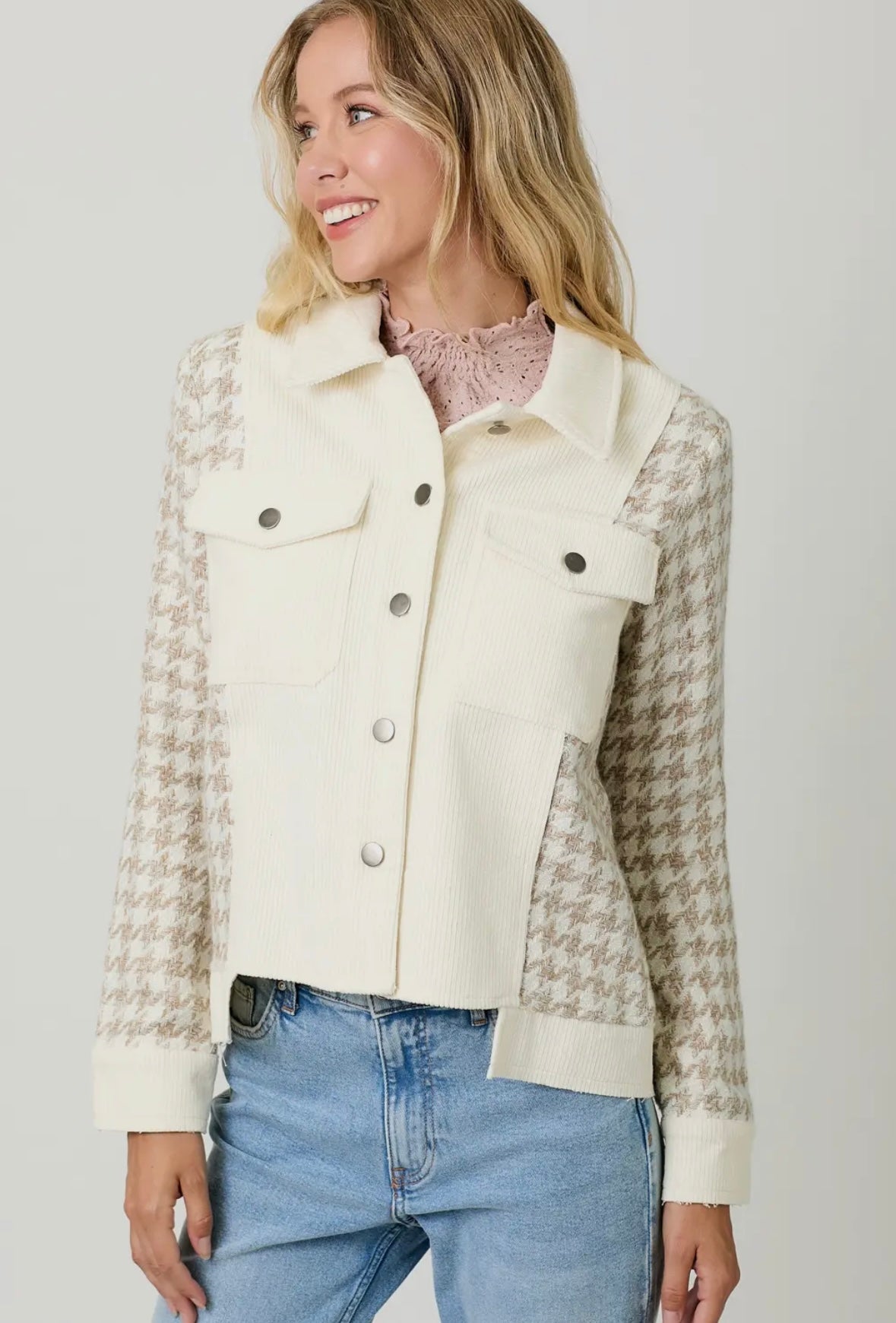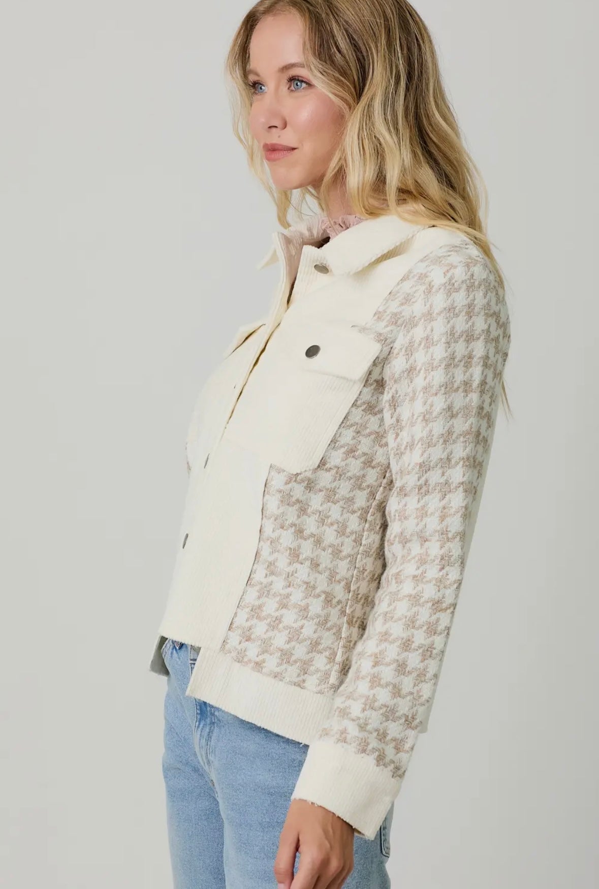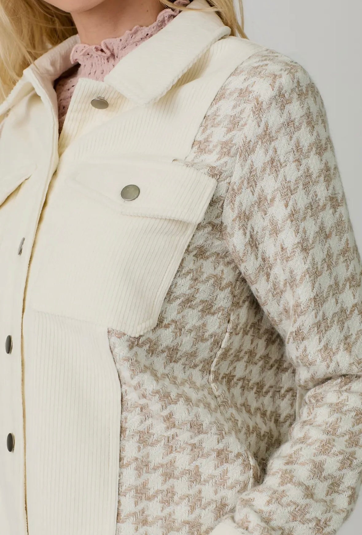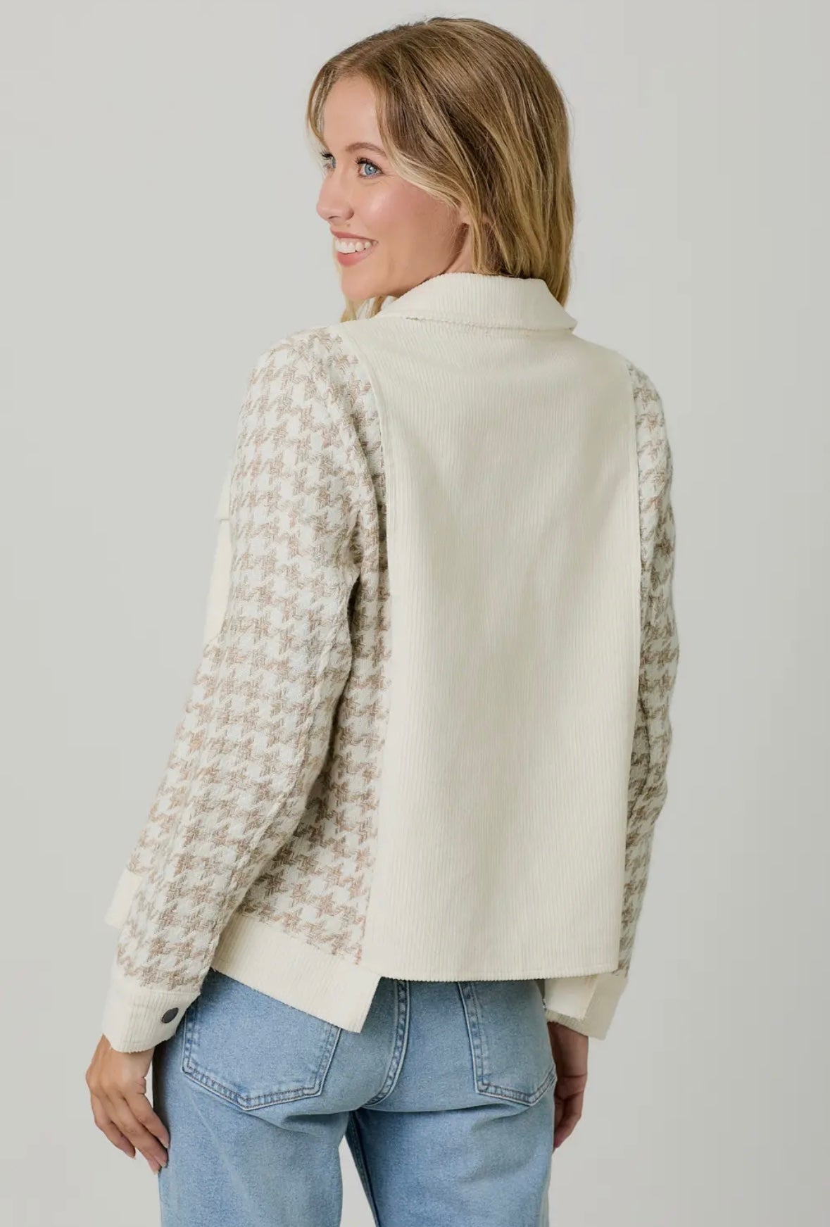 This houndstooth sleeve corduroy jacket in ivory and oat will keep you warm while staying stylish.