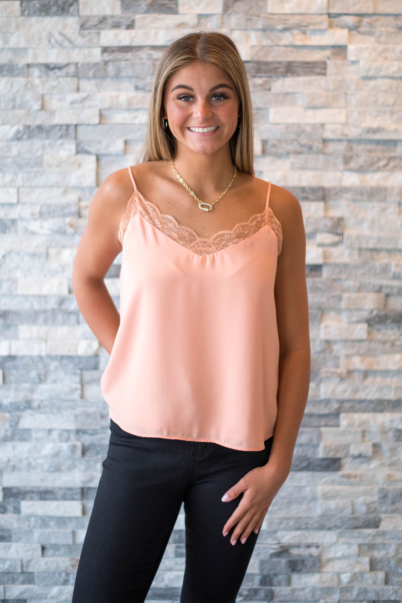 When you need a little more spice in your life grab our Lace Trim Camisole! Silky satin is what makes this flirty fun piece! It features a flowy bodice with a subtle V-neckline and thin straps. The length sits right about the hips making it perfect to wear loose or tuck in to any high-waisted bottom! Our favorite part of this piece is definitely the lace trim detail and the beautiful peachy pink color!