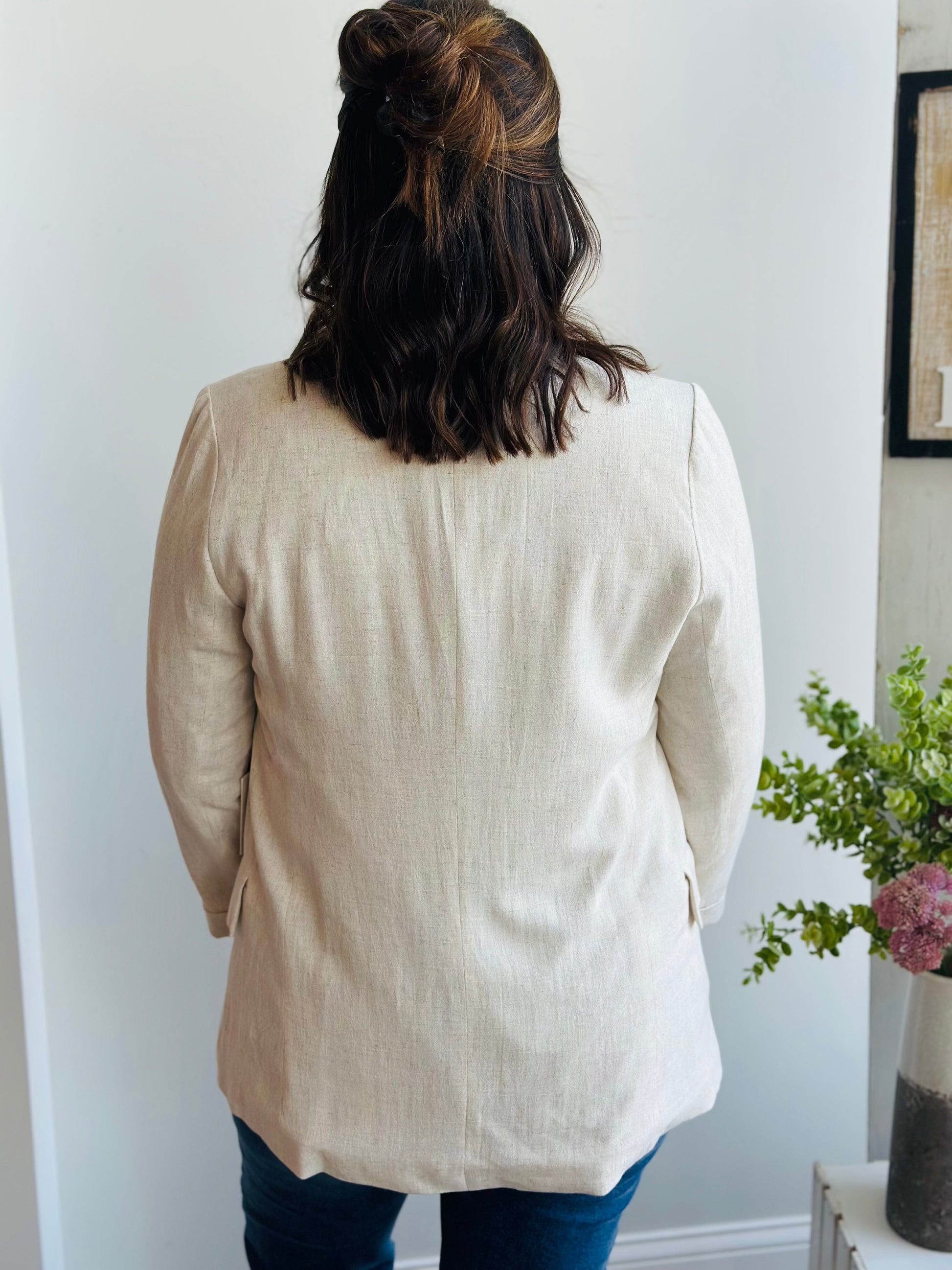 Our Open Linen Blazer is the epitome of relaxed elegance. Crafted from lightweight, breathable linen, this blazer offers a laid-back yet sophisticated look. The open-front design gives it a modern, easygoing vibe, perfect for layering over a simple tee or a blouse. With its crisp tailoring and slightly oversized fit, it brings effortless style to both casual and semi-formal outfits. Whether you're dressing up for a dinner or styling it for the office, this versatile piece adds a touch of polished charm to any ensemble. Ideal for warm weather and transitioning between seasons.