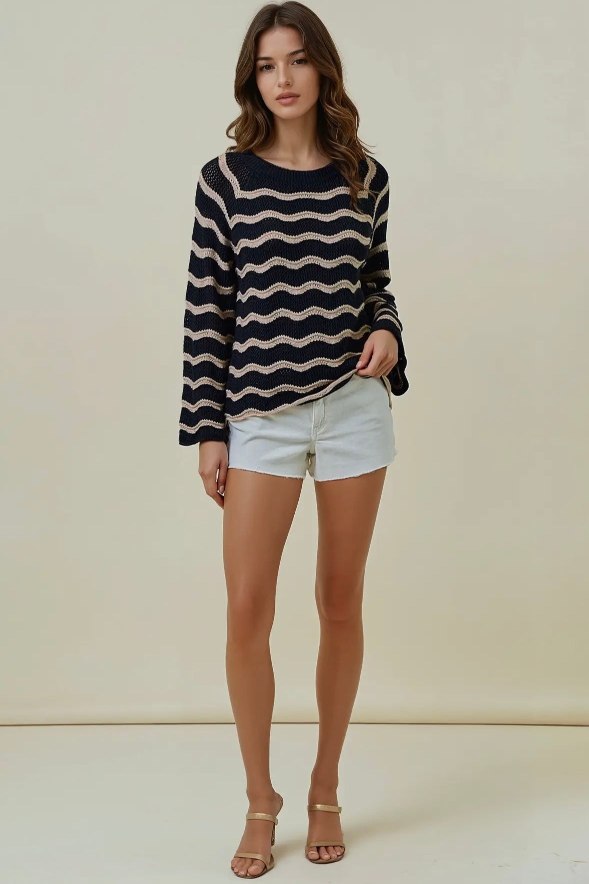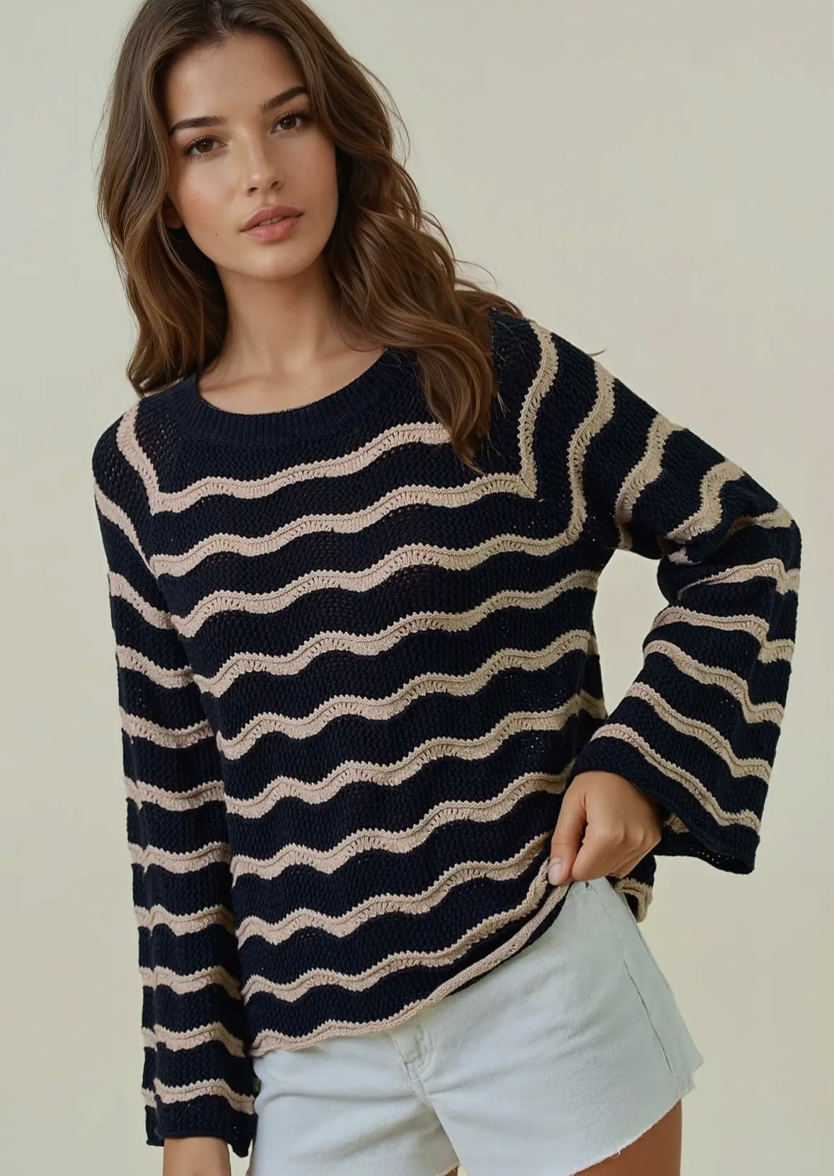Delicate meets daring in our Striped Pointelle Bell Sleeve Top—a feminine piece with just the right edge. Crafted in a soft black knit, this top features subtle pointelle striping for a hint of texture and sheer detail, striking the perfect balance between elegance and ease.