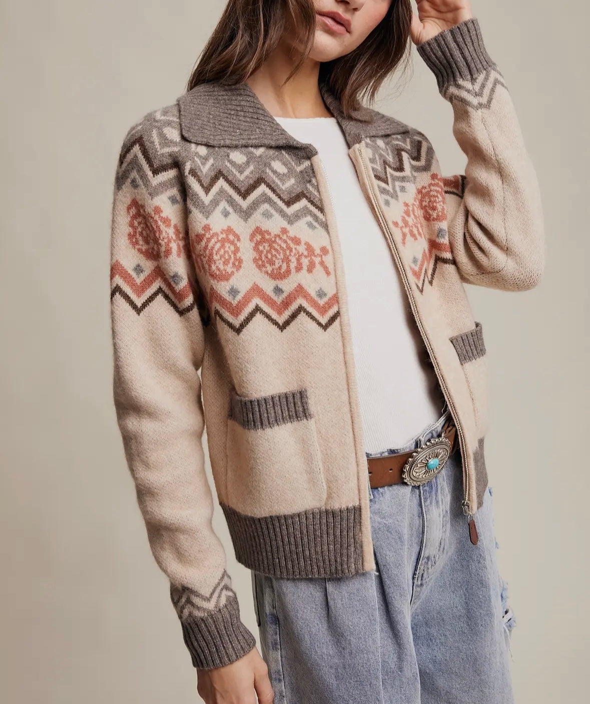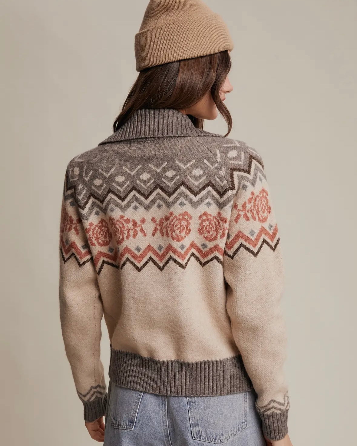 - Design: All-over retro floral and zigzag jacquard pattern in warm earth tones